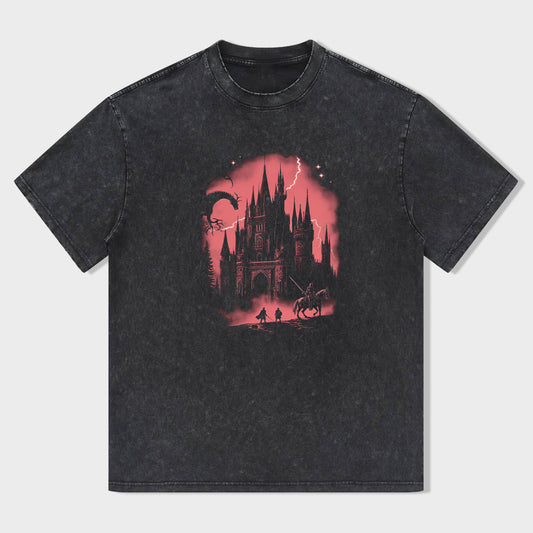 Gothic Castle Silhouette T-Shirt with Bat and Moon Design for Men Women Unisex Graphic Tee