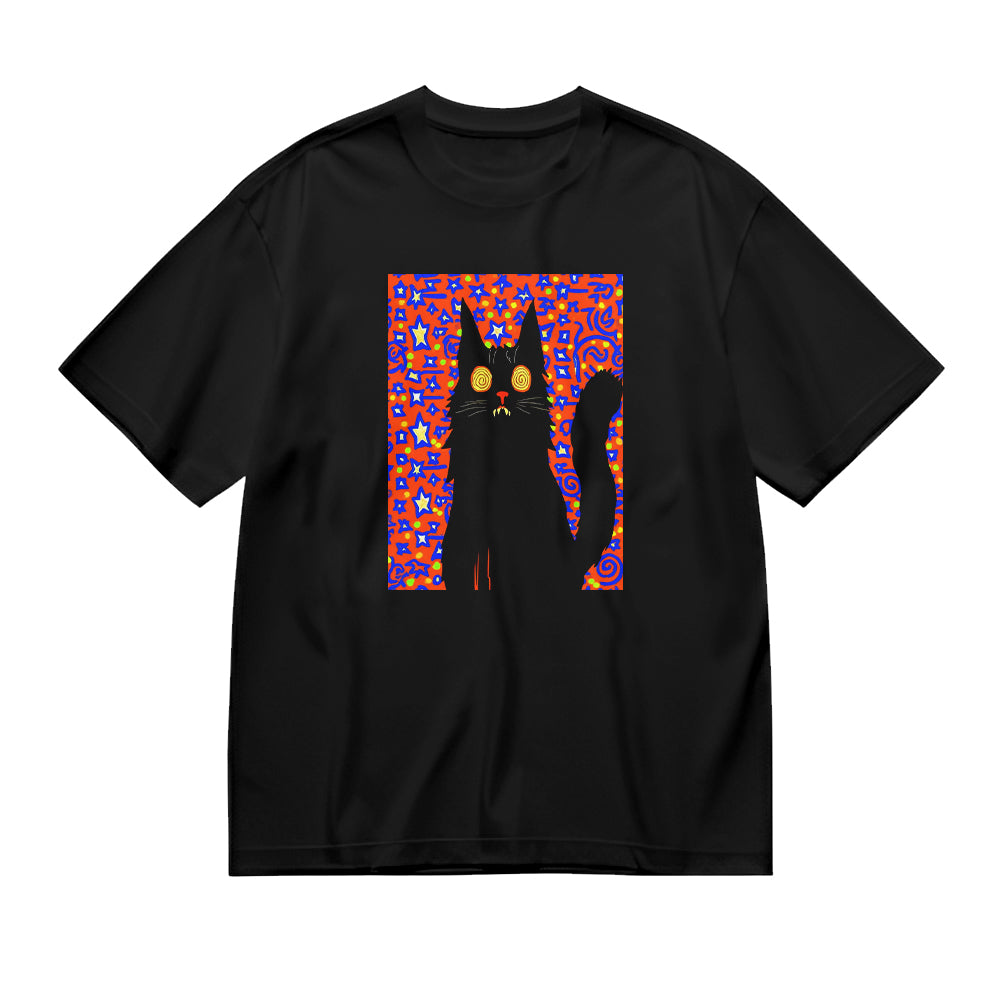 Black T-Shirt with Colorful Cat Graphic Design