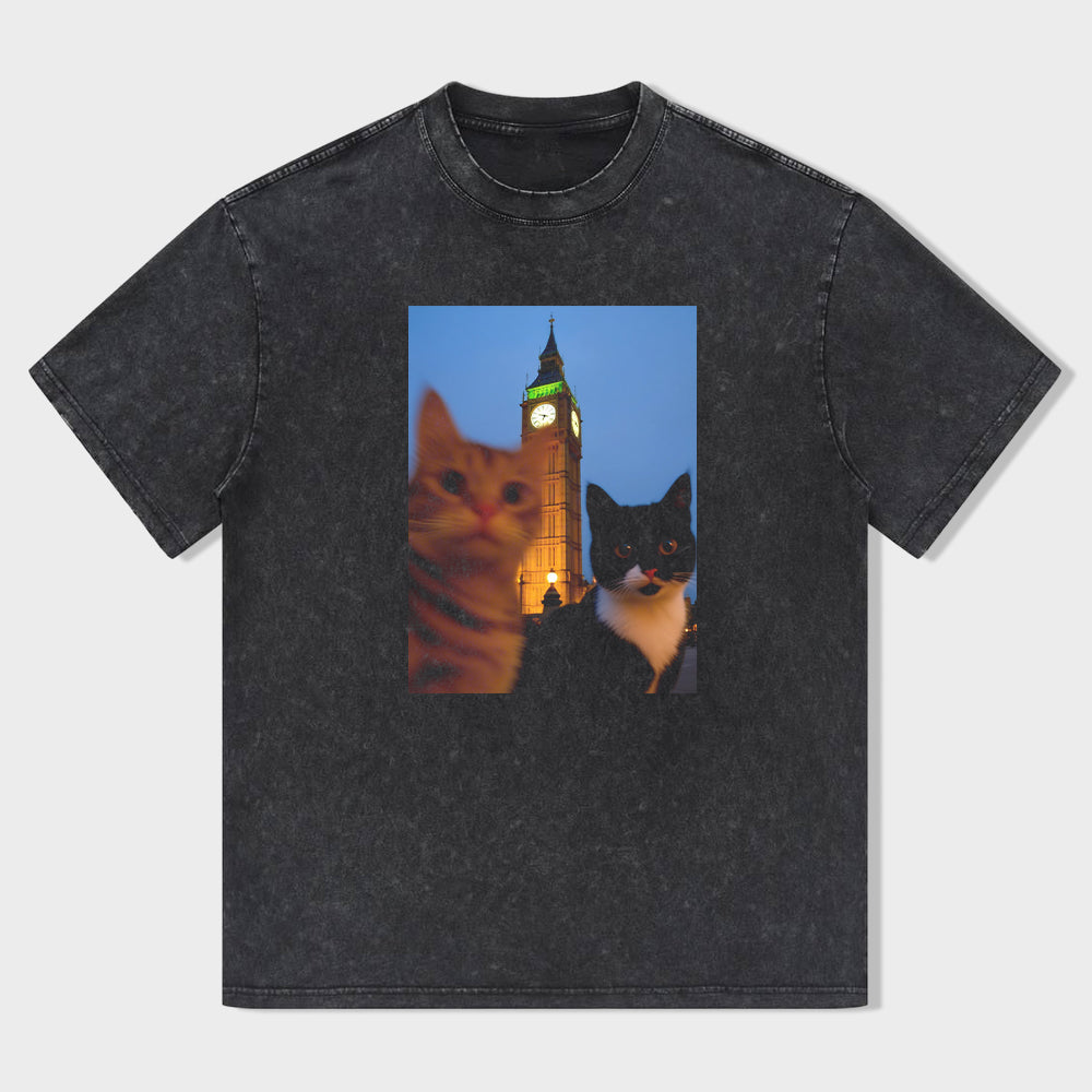 Cats and Clock Tower Graphic T-Shirt