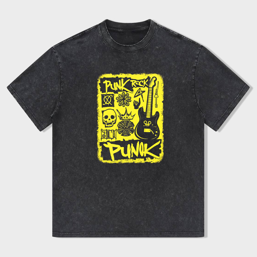 Retro Crew Neck Black T-Shirt with Punk Rock Skulls and Guitars Print for Music Festivals