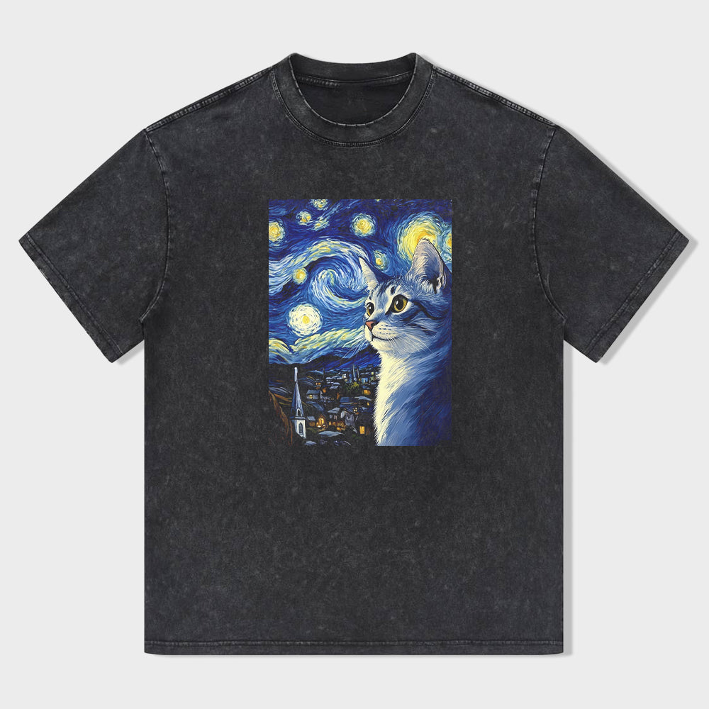 Round Neck Black T-Shirt with Van Gogh Starry Night Cat Print for Casual Wear