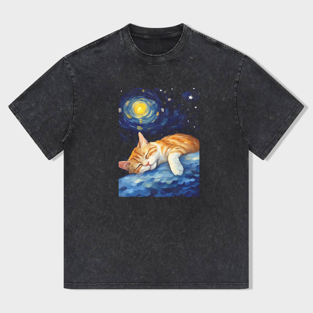 Short Sleeve Black T-Shirt with Dreamy Cat and Galaxy Print for Casual Wear