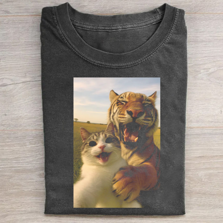Tiger and Cat Selfie Print T-shirt